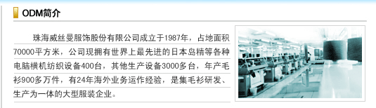 威丝曼C厂是聚设计、生产、营销为一体的ODM毛衫加工企业。“贴牌加工毛衫”是我们的生产强项。自设有前整、后整生产厂房,生产设备先进,拥有一支优秀的管理人才和技术人才队伍,具备年产毛衫80万件以上的生产能力和快速打板能力。
